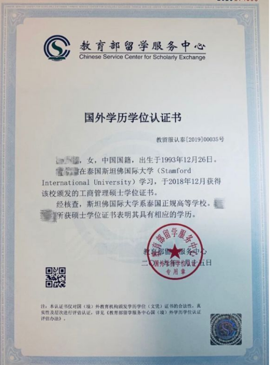 学员持毕业证在中国教育部留服中心进行学历学位认证,提交各项材料后,获得中国教育部留学服务中心《国外学历学位认证书》,该认证书作为学历证书、学位证书在国内通用。