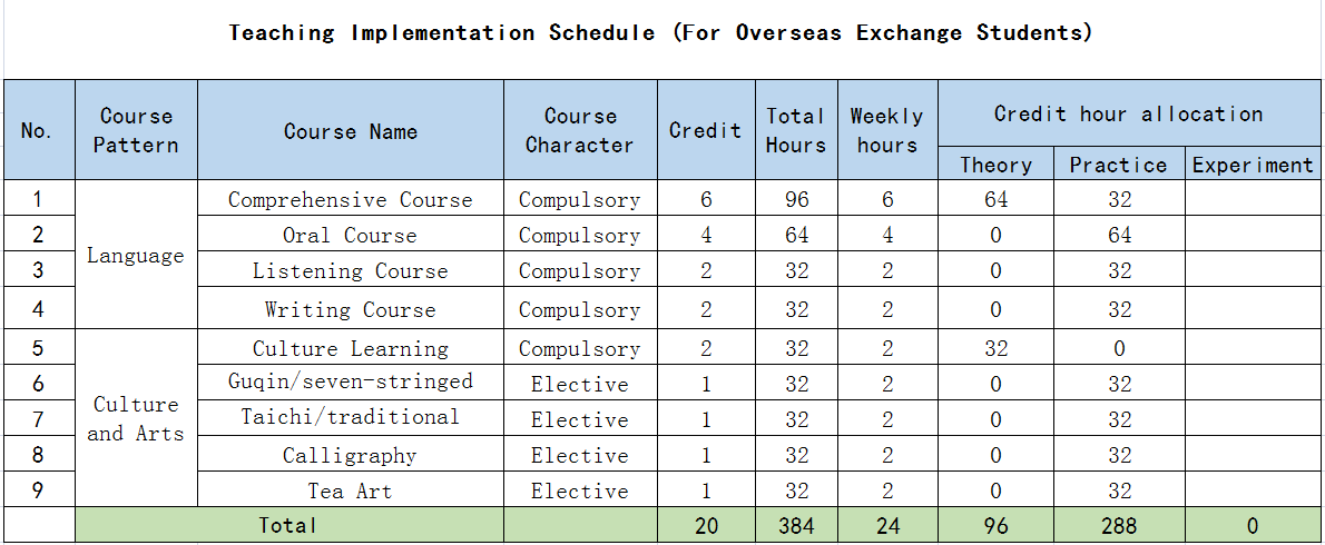 Exchange students can choose up to 18 credits in our school. The following is a list of Chinese language courses and Chinese culture courses available to those who do not meet the language requirements.