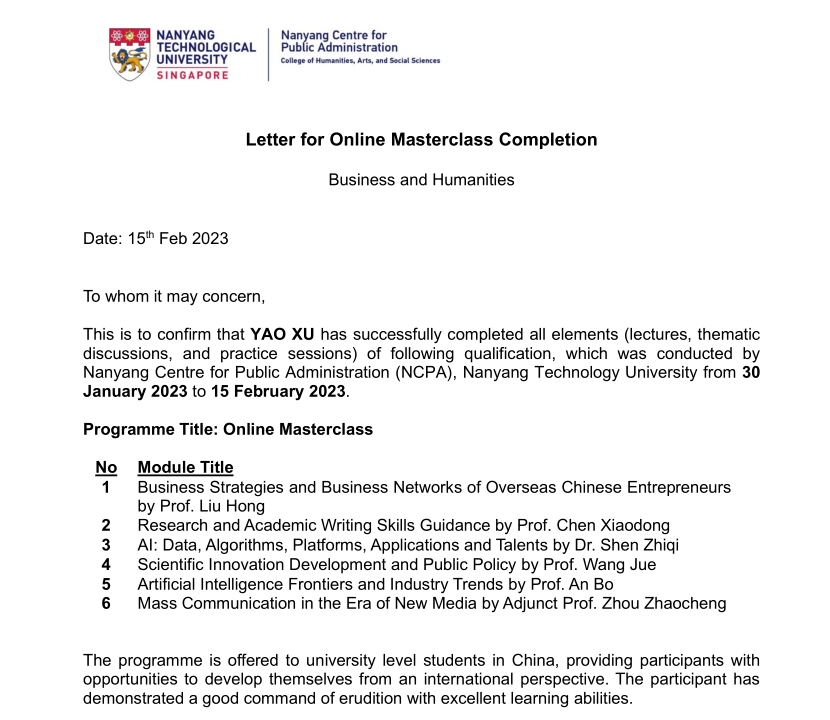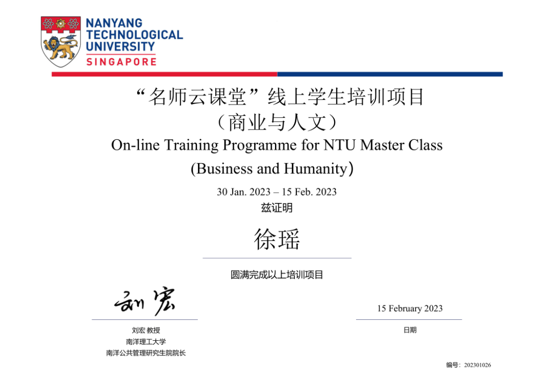 2023年2月,新加坡南洋理工大学组织了“名师云课堂”国际交流项目,授课领域为商业和人文。青岛恒星科技学院徐瑶同学凭借优秀的外语成绩,成功报名录取为项目学员。现在活动已结束,徐同学顺利获得校方结业证书和教授推荐信。让我们来看一下世界名校学习之旅的体验和感悟吧!