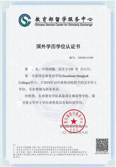 学员持毕业证在中国教育部留服中心进行学历学位认证,提交各项材料后,获得中国教育部留学服务中心《国外学历学位认证书》,该认证书作为学历证书、学位证书在国内通用。