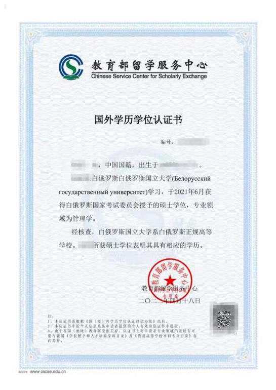学生持毕业证在中国教育部留服中心进行学历学位认证,提交各项材料后,获得中国教育部留学服务中心《国外学历学位认证书》,该认证书作为学历证书、学位证书在国内通用
