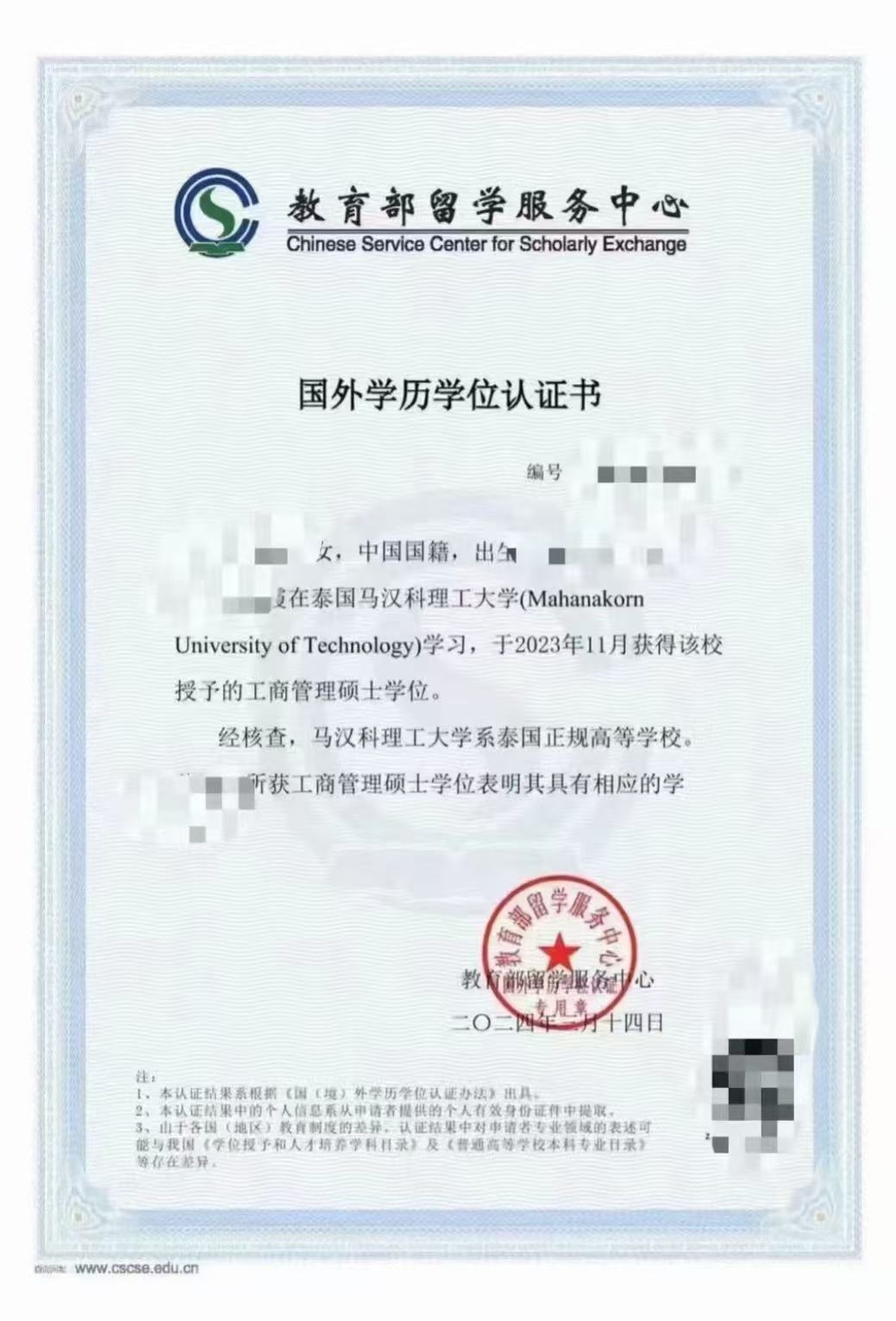 学员持毕业证在中国教育部留服中心进行学历学位认证,提交各项材料后,获得中国教育部留学服务中心《国外学历学位认证书》,该认证书作为学历证书、学位证书在国内通用。