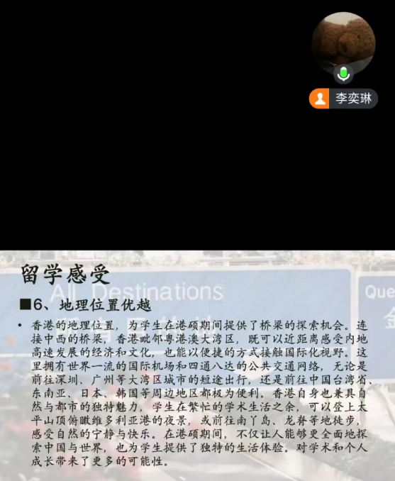 随着时代的不断发展,教学方式也在不断的发展,线上网课,实践课堂,留学...相比日常的教学方式,留学就为莘莘学子提供了一个开阔眼界,磨练自我,获得自我提升成长的机会。人文学院12月13日晚举办了一场香港教育大学线上研学活动,下面是2024届汉语言文学专业毕业生李奕琳同学在香港的经验分享。