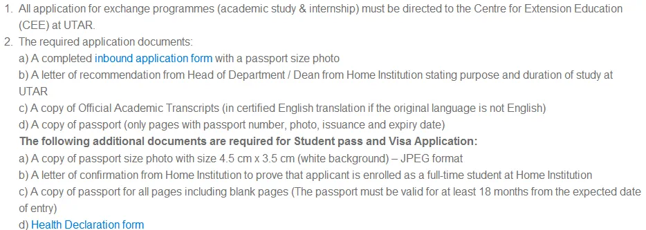(5)缴纳给UTAR费用:总计约3419马币,包括行政费入境交换、EMGS 处理费、EMGS 医疗检查费、EMGS 医疗和健康保险、EMGS i-Kad、EMGS E-Val、学生准证、多次入境签证费、保证金、押金。其中保证金、押金共2000马币将在交换学习结束后退还给学生本人。